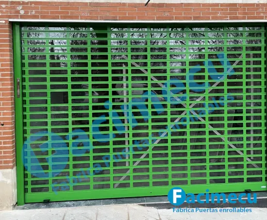 Puerta enrollable automática de aluminio troquelado con metacrilato